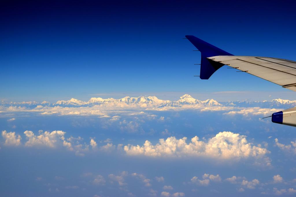 Just after breakfast, Ranjan da came down to my place with a cab and we both headed towards Terminal 3 of Indira Gandhi International Airport. Dhananjoy was in touch with us all throughout. He started from his quarters and boarded the Airport Express Metro to reach Terminal 3. The boarding queue was long but finally, we made it through the check ins to the departure gate. We were careful with our seat selection in order to get window seats to get glimpses of the Himalayas as soon as the aircraft took off. Before boarding the aircraft, we spoke to Niladri on phone. His train was running late by an hour. After that conversation, he went out of contact as he entered Nepal from the Raxaul border. We were deprived of the views during the initial part as clouds held a veil in front of The Himalayas. The ranges of Garhwal and Kumaon eluded us, but gradually the clouds cleared up and once we were passing the ranges of Central Nepal, we could clearly identify Dhaulagiri, the peaks of the Annapurna range and the “double-edged” summit of Manaslu, our destination.
