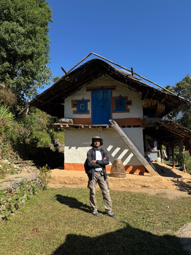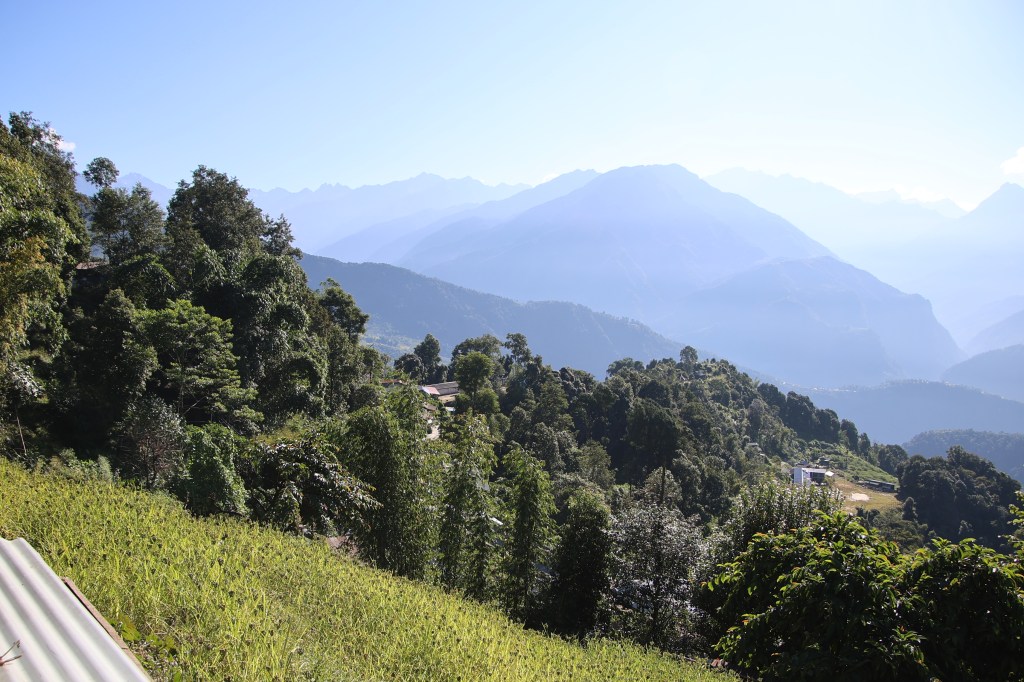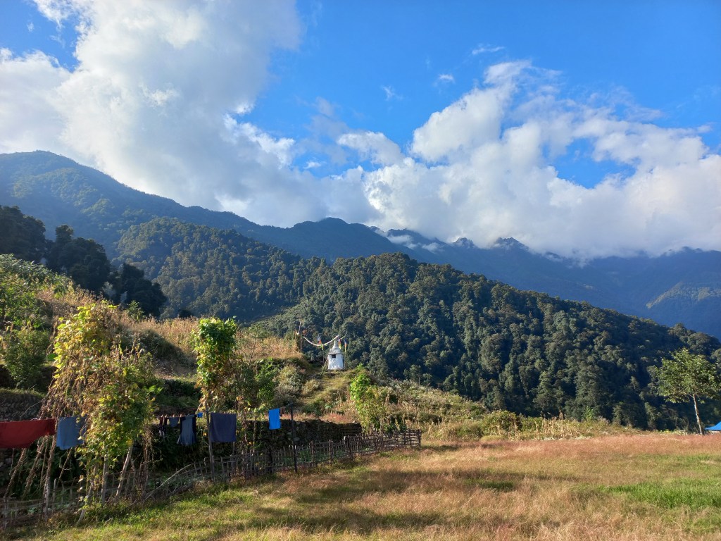 A few wooden trunks were laid in the lawn which acted as chairs. Another one was placed in front, acting as a table. We stretched our legs and sat on these amid bright sunshine. The surrounding hills wore a thick vegetation. We enjoyed a few beers in the perfect weather. While our phones didn’t work, but local phone calls were possible using a landline. They charged 50 NPR for each call. We informed our respective homes about our safe arrival. We were tempted by prospects of a mutton curry, but that turned out to be non edible. We finished the rest of the lunch. After that, Dhananjoy mustered enough energy for an afternoon village stroll but me and Kunal preferred to rest our legs. Sitting in the lawn in perfect leisure, I dosed off. When I woke up, I found the afternoon sun was showering its rays on the distant hills. The sun illuminated the clouds above them.