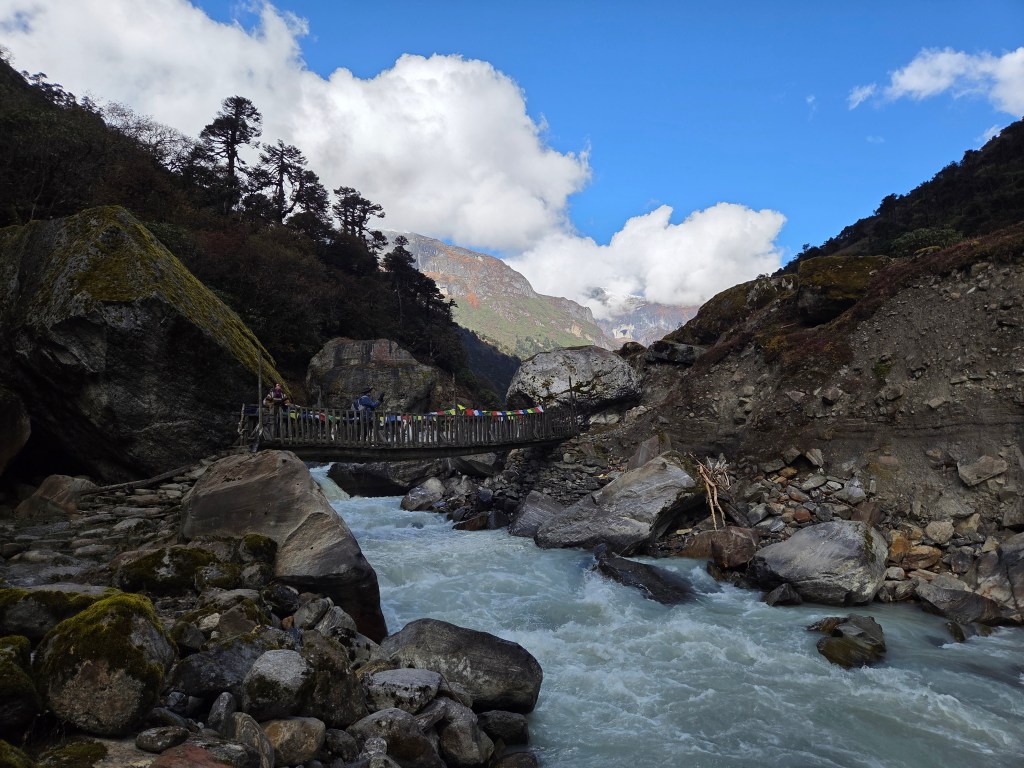 We followed our plan and had breakfast. Afterward, we wrapped some packed lunches (of rolled chapati and jam) in our day packs. Then we started the journey. That is because, beyond Yangle Kharka (the next place of halt), there aren’t any other lodges before Langmale. Actually, there is a lodge after Yangle but it is closed now. We saw a sick lady at Phemathang who was the owner of that lodge. She was going down to her village in the lower valley to recuperate. After the usual ceremony of a group photograph, we started our journey. The trail went gradually ahead along the banks of the river. We couldn’t see it because of the elevated height of the gorge. However, we kept hearing its sound getting louder. After some more walking, we reached a bridge over the river. The bridge transported us to the right side of the Barun river and the trail started moving up.