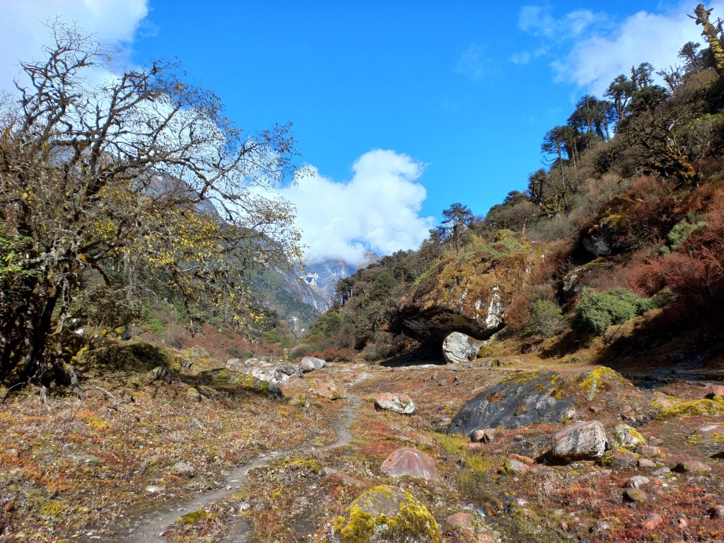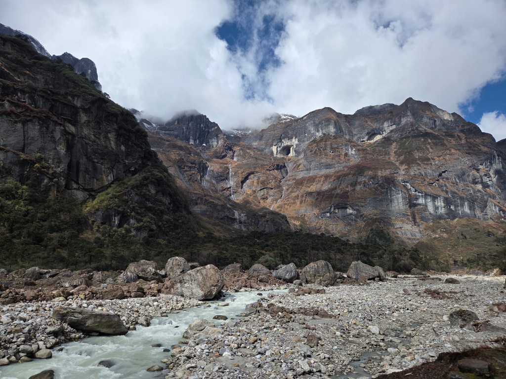 But Makalu wasn’t visible. Langmale lay somewhere on that elevated plateau. For us, the immediate milestone was to reach the top of that plateau. This was our second traverse of landslide zones after the one we crossed before reaching Phemathang. It didn’t appear that scary on this occasion despite being at a higher altitude. The daylight had a role to play and so did our state of mind. They kept coming one after another. For each, we had to cross a stream of debris. Boulders of different size & shape stood as obstacles and we circumvented or tiptoed over them. Some of them didn’t like our presence and threatened to topple us, but we finally managed to reach the base of the elevated plateau. It was a sight of wreckage and destruction. The trail rose through an ensemble of boulders and pebbles in leaps and bounds. We followed along with careful steps. On our way we came across a group of trekkers from Bengal on their way down. All of them were above 60 years in age. They shared their experience at the base camp. Their description of the route and the views lifted our spirits. The bade good luck and we moved in our respective directions. One part of my mind envied them as their milestone was fulfilled. Another part pitied them since their joy was over.