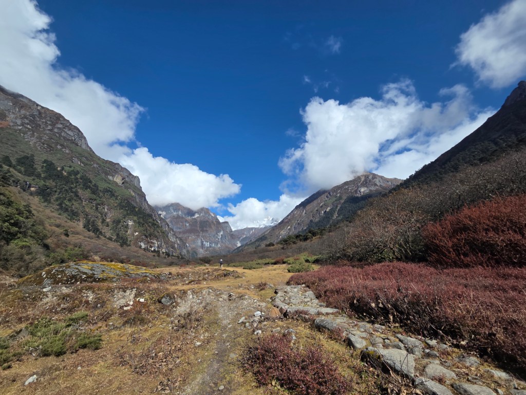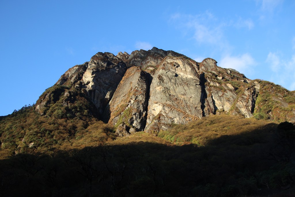 It was about 12 when we stopped by a hut to have our lunch. The rolled chapatis hardened and we had a tough time to tear them into pieces. Once done, the pieces had to be forced down our throats, often with the help of water. Taste was unimportant, filling the stomach was. As soon we stopped walking, the cold winds started. This often causes a dilemma. Walking causes you to sweat, forcing to take off your jacket or hat, but halting brings the cold back. I repeated the spells of taking warm wears off and on, causing much inconvenience for the guide. Raju was walking with me and always helped me with these interchanges by holding my day pack. Beyond the bushes, the trail moved into a landslide area. Before that, we went past a closed house. We met the owner of this house in Phemathang in the morning. I stopped for a moment to have a look at the route ahead. It went through multiple landslide areas to reach at a base. There was huge jump in elevation at that point. Beyond that, the terrain wasn’t visible from where I stood. Beyond the horizon, huge massifs of the Himalayan peaks formed the skyline. We recognized Mt Nepo, Mt Chamlang and other peaks.