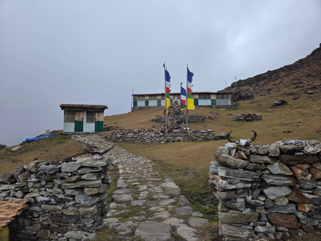 The lodge was on the right with a set of rooms. One of the rooms advertised the facility of a hot shower, the first of it’s kind on this trail. Shivadhara is a sacred waterfall in this region. The legend says that Lord Shiva created this waterfall with a stroke of his trishul. It falls from a height of about 500 m from a hole in a cave. The route towards it diverts from a place beyond Yangle and that trail is challenging. There’s a section where one has to step over wooden planks fixed on a vertical wall. I’ve watched videos about it and kept it out of our syllabus. It also required more days. We saw many local groups heading for that place. It’s considered a sacred pilgrimage in this part of Nepal.