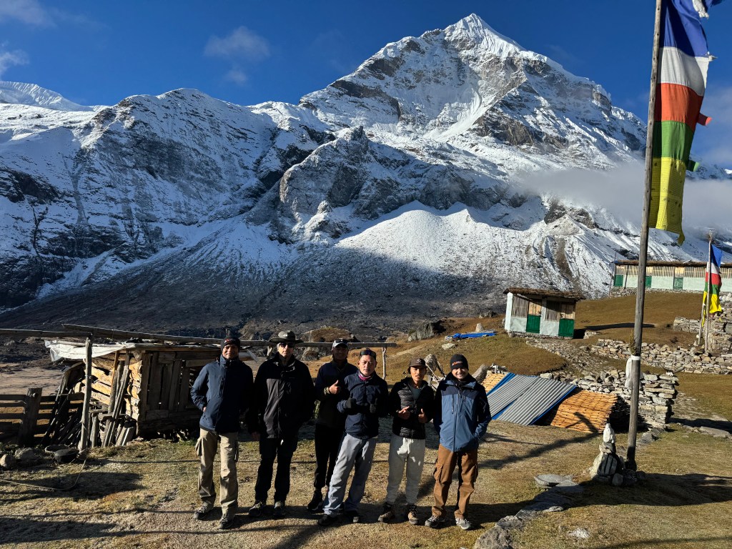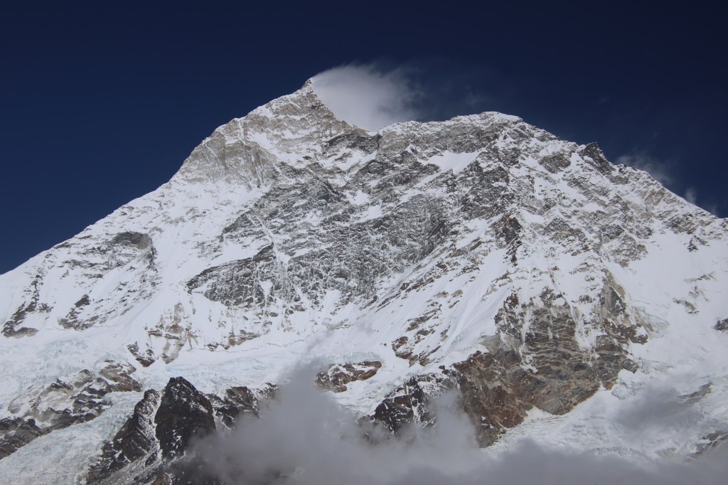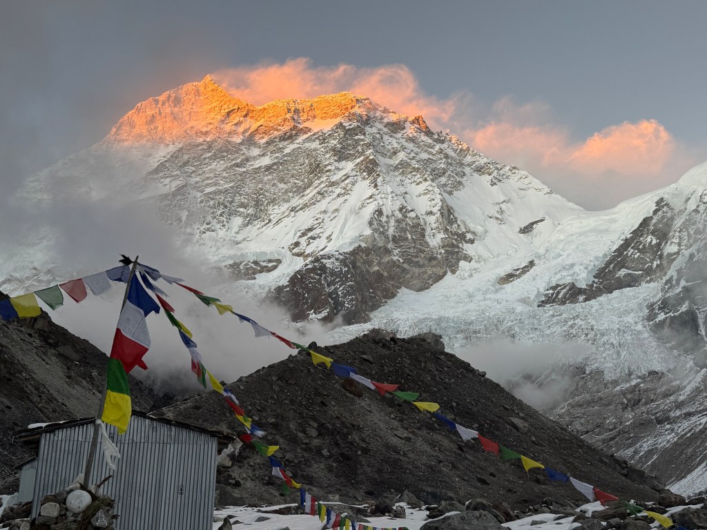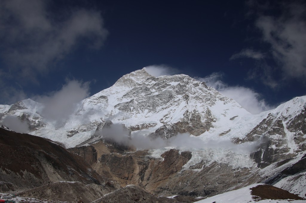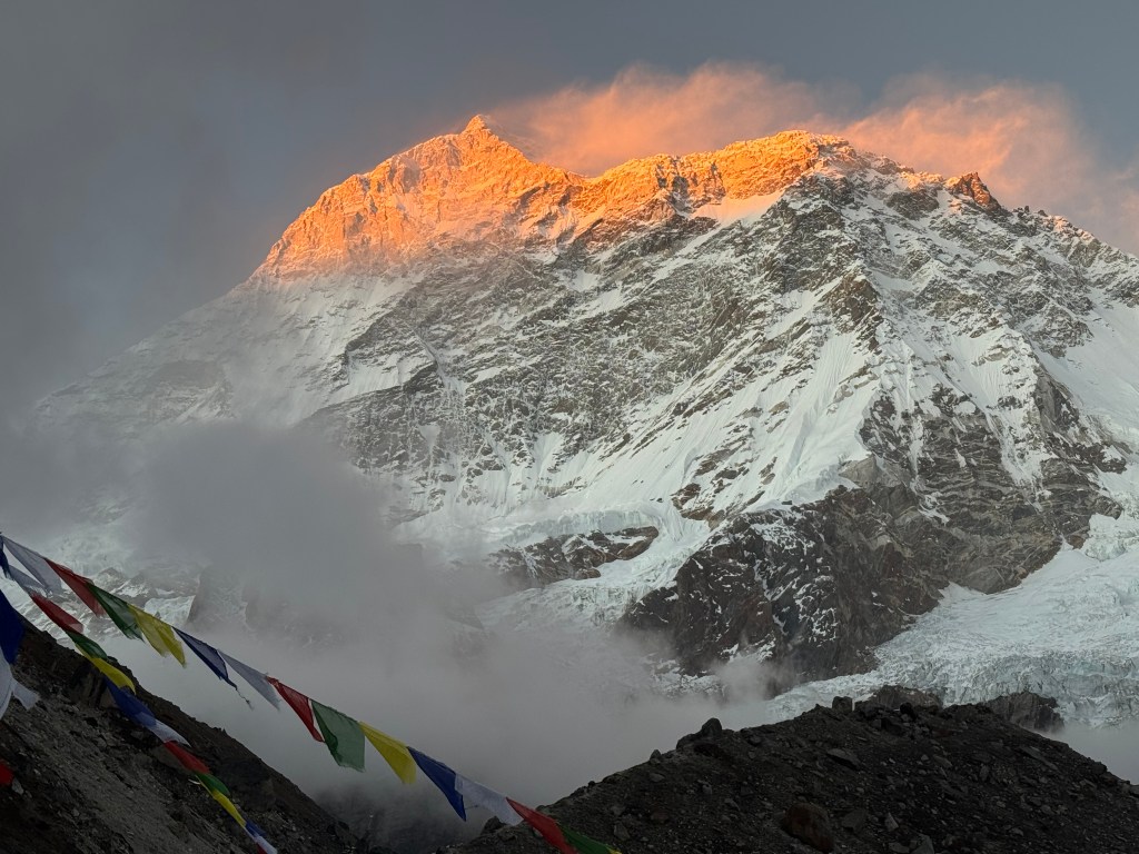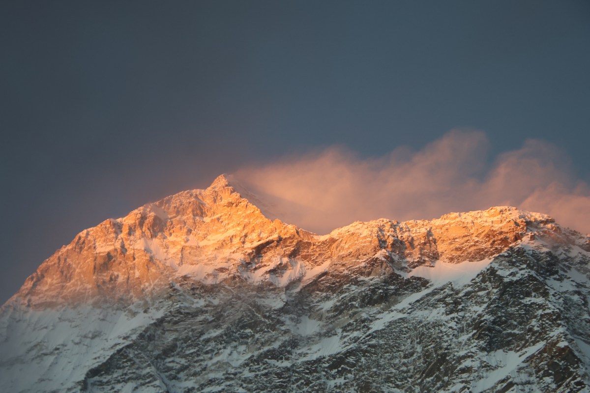 We were playing cards in the dining room. While we played, I saw one of the members of the Slovenian group quickly come inside. They informed their group promptly. The members dashed out of the room with cameras. We followed them outside and there it was, Mt Makalu, colored with crimson-gold in the fading light of the sun. The clouds still held sway but the view cleared just enough to unveil the glorious show. It was nature’s way of bidding goodbye to a splendid day. The winds were strong. We were grateful to the ladies of the Slovenian group. They kept vigil in the biting cold while we enjoyed the warmth of the dining room. It was tough to take the snaps. Operating the camera was impossible with gloves. We had to remove them. We kept taking the snaps ignoring the numbness of our fingers. The pain was worth. The upper section of the massif wore the crown of gold. Plumes of snow flew up from its summit because of the strong gales. The rest of the massif was shielded behind the clouds. The upper massif was floating amid the clouds with a crown overhead. We remained there and continued taking snaps till the last tinge of color faded away like a dying ember.
