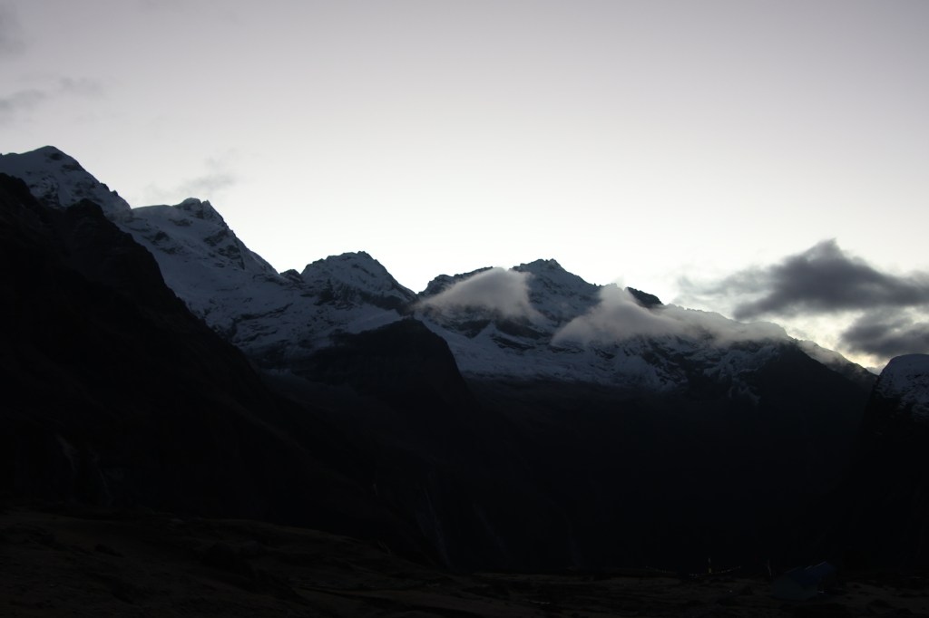It started with a soft light gradually diluting the darkness. The silhouette became more prominent. Beyond the point where the trail to base camp disappeared into oblivion, rose Mt Chamlang dominating the horizon. Moving anticlockwise from there, there was Mt Nepo, Mt Sersong and other Himalayan peaks, still dark in their appearance. Winds dashed our faces but we persevered.