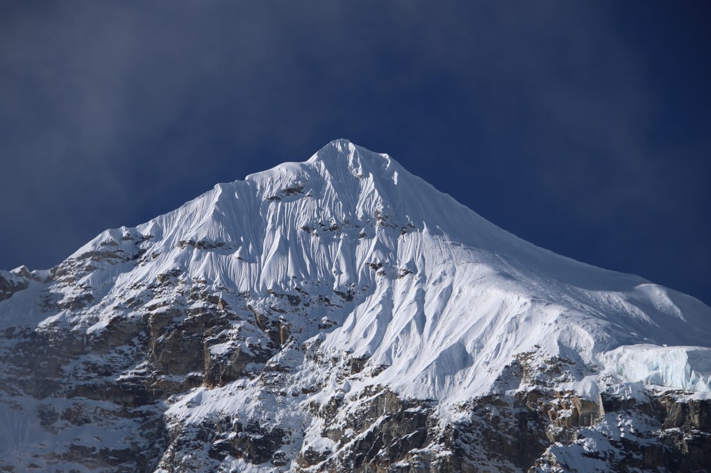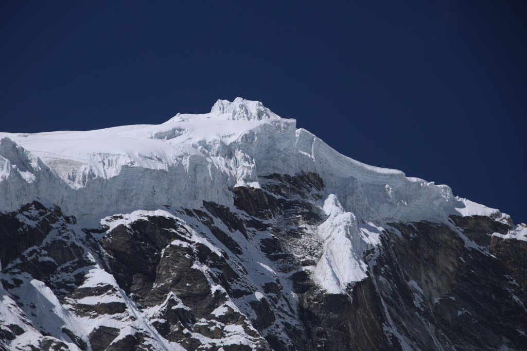 Mt Chamlang absorbed the first brush of gold. Mt Nepo wasn’t far behind either. Nature’s paintbrush worked wonders in the canvas of the mountains. Their slopes, glaciers and ice falls struck gold. The canvas changed colors by the minute. Gold gradually faded out giving way to a silver blaze. The mountains basked in their full morning glory amid clear skies. Small fluffy clouds floated along their edges. All of the mountain summits were wrapped in white scarves. These were plumes of snow particles sent out into the sky by gales of strong winds dashing at their summits.
