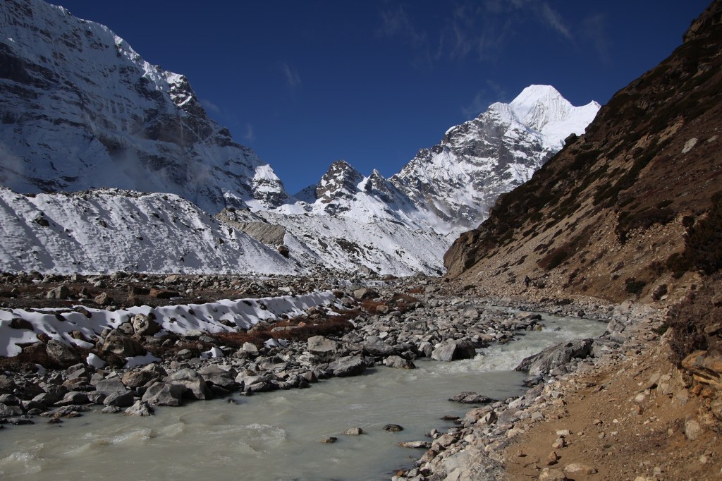 Its torrent was less violent in the valley. The streams started to freeze. They flowed amid frozen ice. The valley was barren and wide, strewn with boulders. The Barun river formed its outer rim. Beyond that, rose the mountains. The ground was almost flat during the first part of our journey. The glaciers along the mountains were getting clearer and so did the contours of their slopes. With every step ahead, the mountains drew nearer and increased in stature. The landscape was totally devoid of any vegetation. It was all about snow and rocks.
