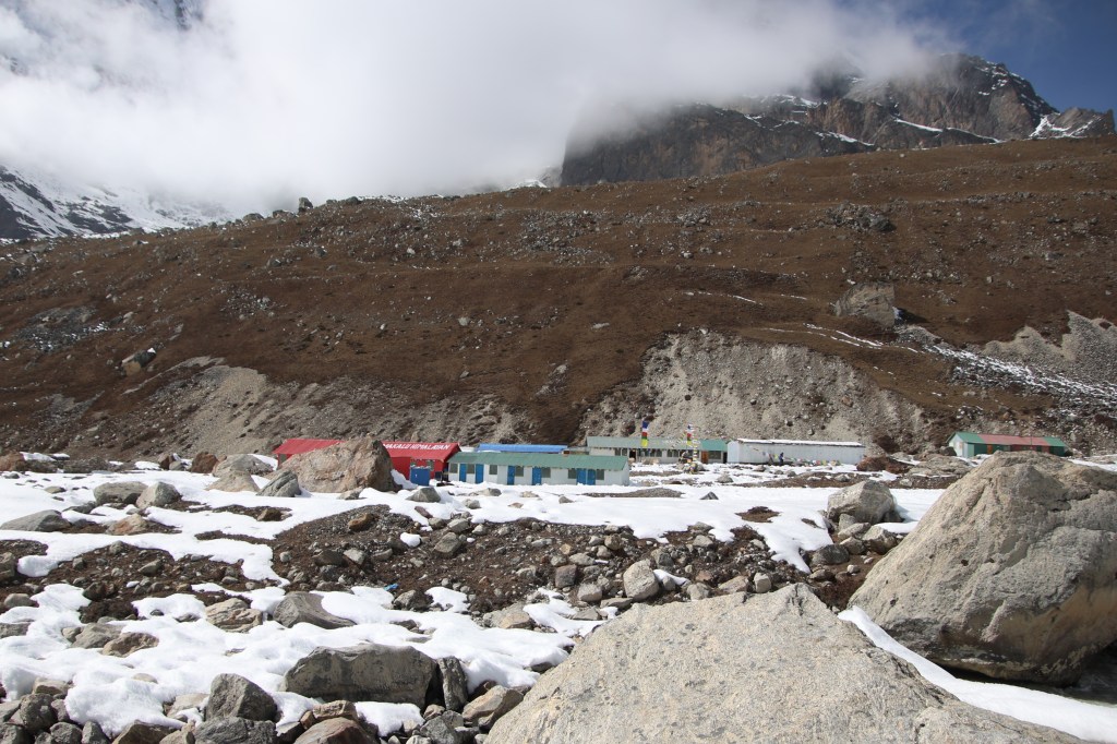 As I walked over and stood on the bridge, it gave a sense of coming to a “known” place. It was a unique feeling, given that we were visiting the place for the first time in our lives. The Barun river was flowing beneath it. It came down from the glaciers along the southern slopes of Mt Makalu, which stood right in front of us. Beyond the bridge, we took a few more steps on the accumulated snow. Then we entered the premises of the base camp. There were about 4-5 tea houses at the base camp.