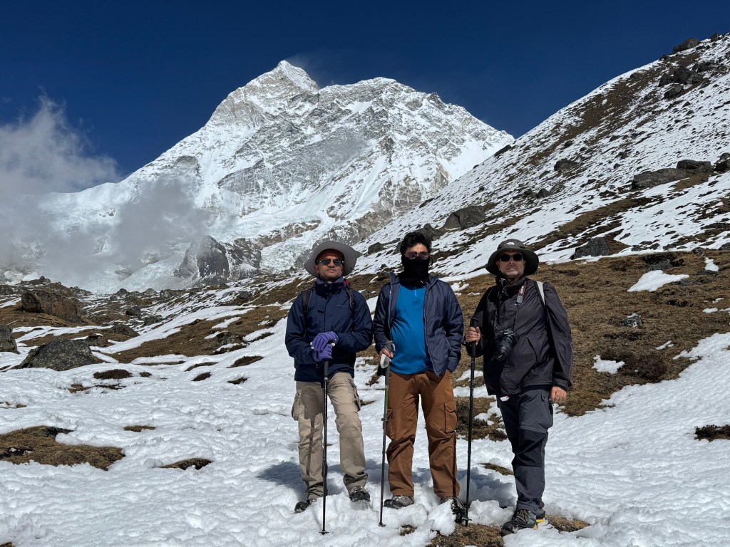 The trail now gradually moved towards the left edge. There was just enough space for a single person to move at a time. To our left, the slope went steeply down to the banks of the Barun river. To our right, the steepness was the same, but upwards. Our porters and guide Raju were leading the way. Anil moved in front of the group. Raju was behind or in front of me, depending on the incline and the support I needed. Manoj was guarding the rear. Thus, our small train navigated the steep slope. It was now completely filled with deep snow. We kept an eye out for the signs of the base camp. The entire landscape was dazzling white. The sunlight reflected from the surface and increased the glare. We couldn’t see anything on the LED displays of our cameras and mobile phones. It’s tempting to remove the glasses. We wanted a clearer view, but we were aware of its impact on our eyes. The views were mesmerizing. We had to rely on guesswork while training our lenses because the LED displays let us down. The entire massif of Mt Makalu dominated the northern horizon.
