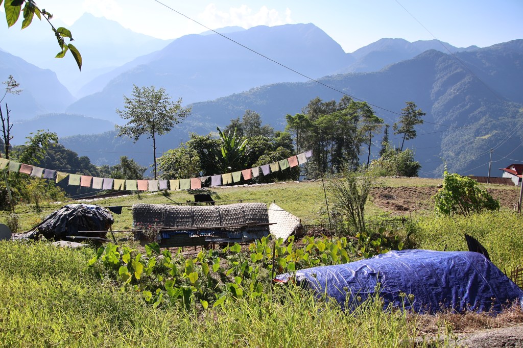 It was about 12 when we stopped by a hut to have our lunch. The rolled chapatis hardened and we had a tough time to tear them into pieces. Once done, the pieces had to be forced down our throats, often with the help of water. Taste was unimportant, filling the stomach was. As soon we stopped walking, the cold winds started. This often causes a dilemma. Walking causes you to sweat, forcing to take off your jacket or hat, but halting brings the cold back. I repeated the spells of taking warm wears off and on, causing much inconvenience for the guide. Raju was walking with me and always helped me with these interchanges by holding my day pack. Beyond the bushes, the trail moved into a landslide area. Before that, we went past a closed house. We met the owner of this house in Phemathang in the morning. I stopped for a moment to have a look at the route ahead. It went through multiple landslide areas to reach at a base. There was huge jump in elevation at that point. Beyond that, the terrain wasn’t visible from where I stood. Beyond the horizon, huge massifs of the Himalayan peaks formed the skyline. We recognized Mt Nepo, Mt Chamlang and other peaks.