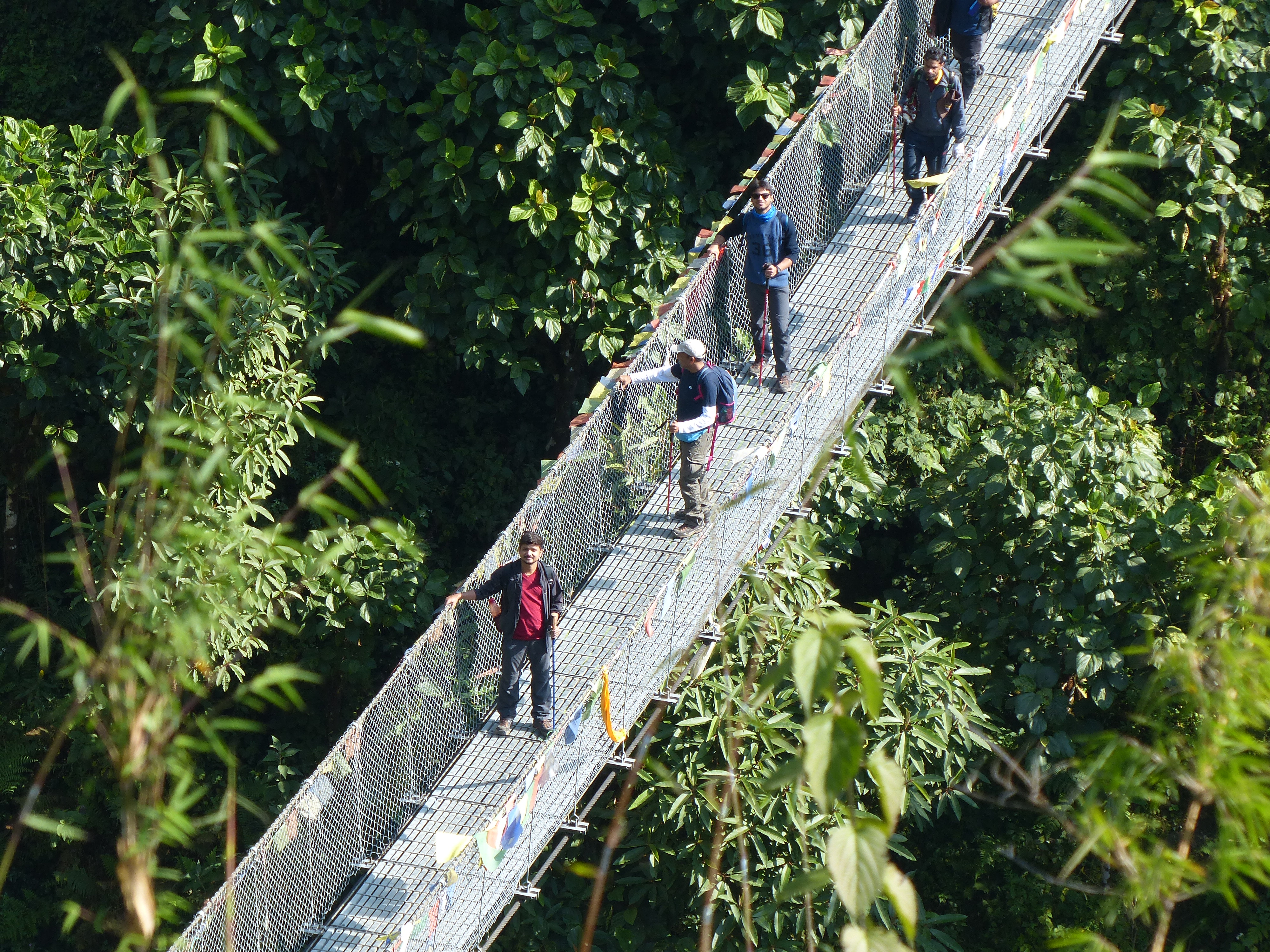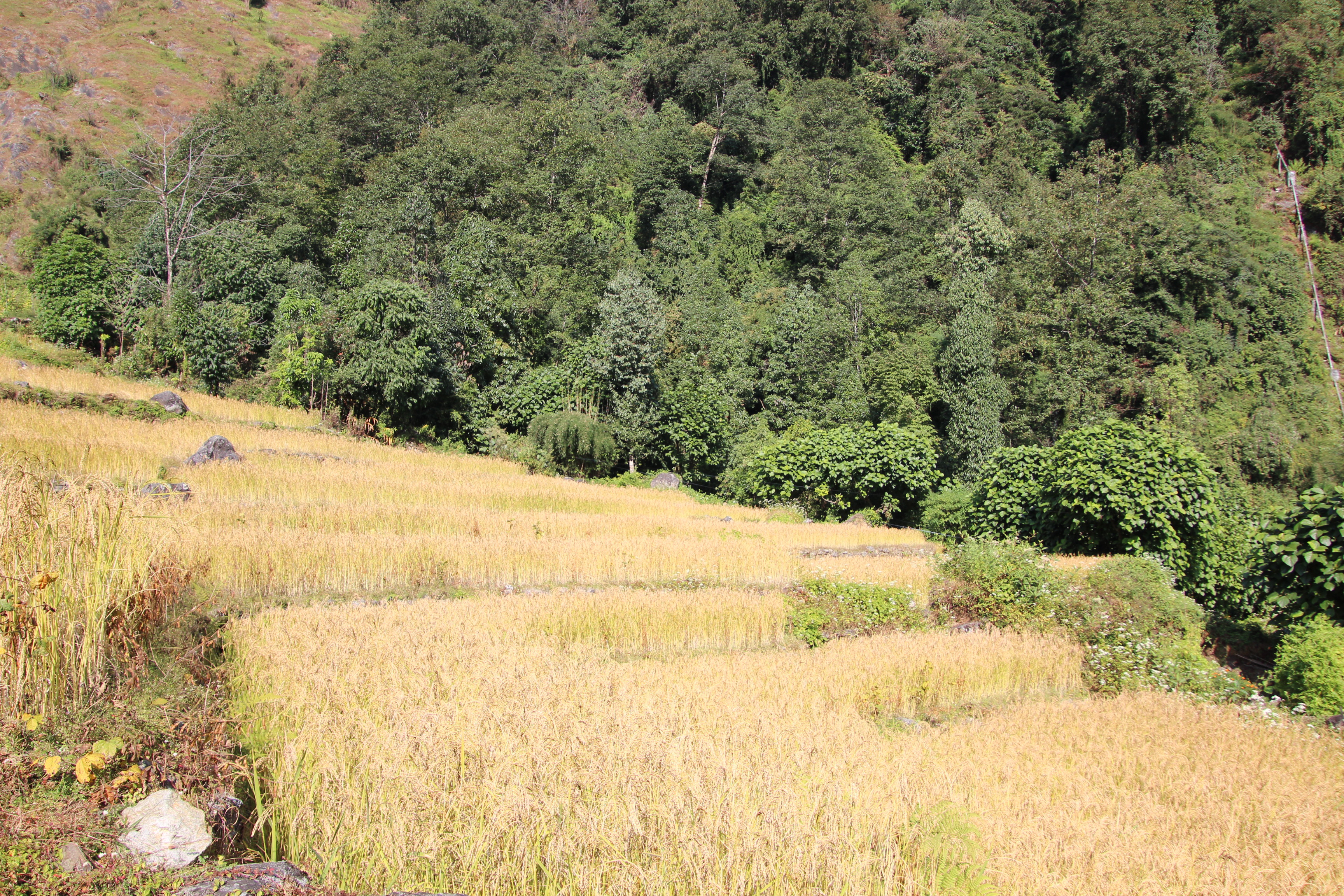 Boulders studding the river bed, bore the signs of the flowing torrent over the years which carved its own sculpture and pattern over them. After walking down the banks, we came across a suspension bridge which carried us to the other bank and a steep hike followed. We passed along villages where people were engrossed in their daily work. That mainly involved working in the fields, taming the roaming herds of goats to guide them to the pastures or towards home. Kids continued to cross our ways and we obliged them by distributing lozenges. Greetings of “Namaste” (a standard Nepalese respectful greeting) were exchanged. This greeting would gradually change to “Tashi Delek” (the Tibetan word for welcome) in the upper reaches inhabited by Tibetan refugees who came across the high mountain passes from trans Himalayan regions to settle in those areas after Chinese occupation of Tibet.