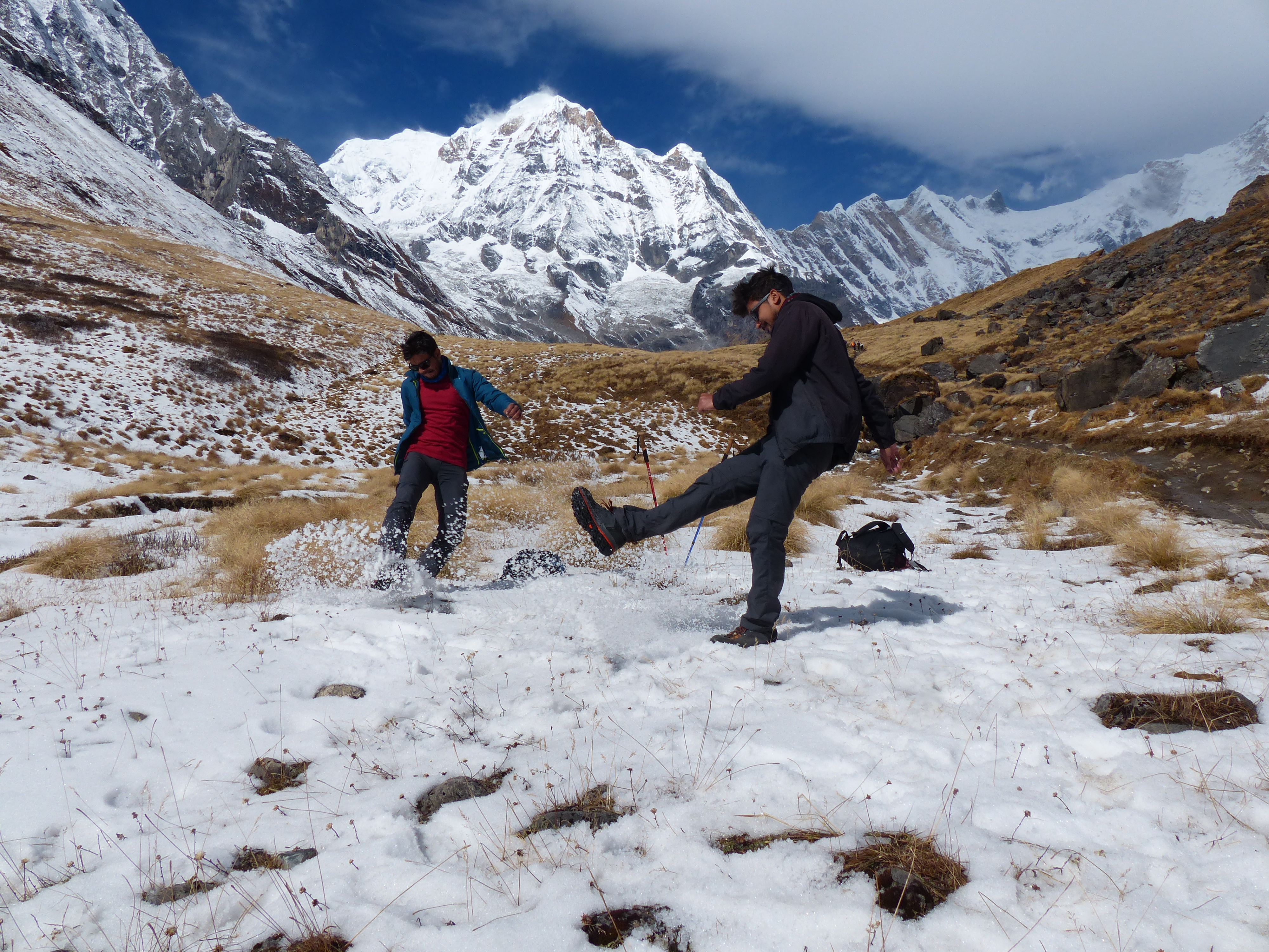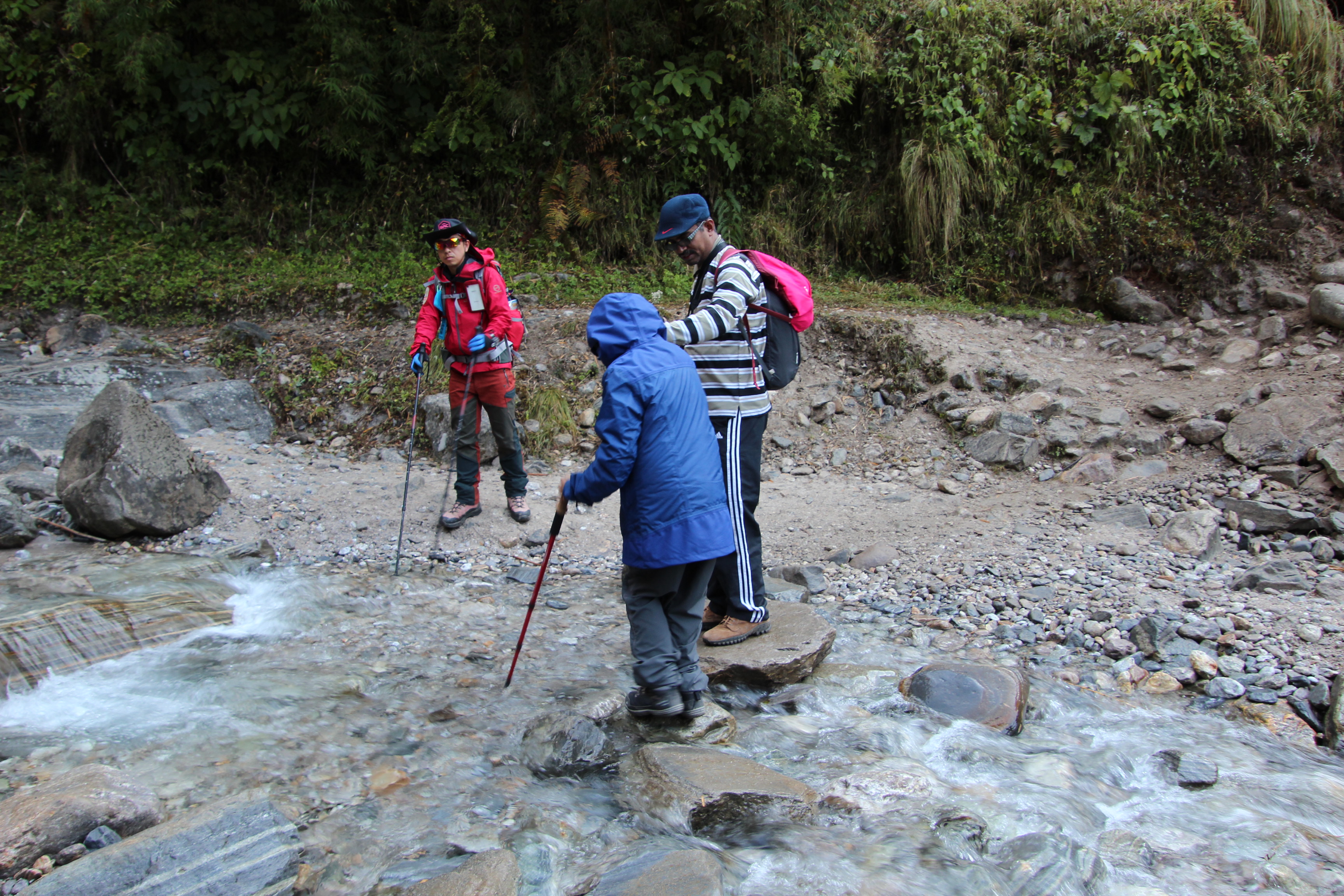 Previous night, our guide briefed us about the day’s plan at the dinner table. His English is difficult to follow and he doesn’t know Hindi. It proved challenging for us to follow his words, but as the trek went through, we got used to him. The plan for the day was to walk up to Machhakhola, the next destination on the route. This was the first day of trekking. I finished the breakfast with corn flakes and milk, while others had pancakes or muesli. It was time to stripe up our respective backpacks and get going. Everybody carried two bottles of lukewarm water with them. The bags were ready, accounts were squared up at the tea house, the sticks were in our hands and we were ready to hit the trail.