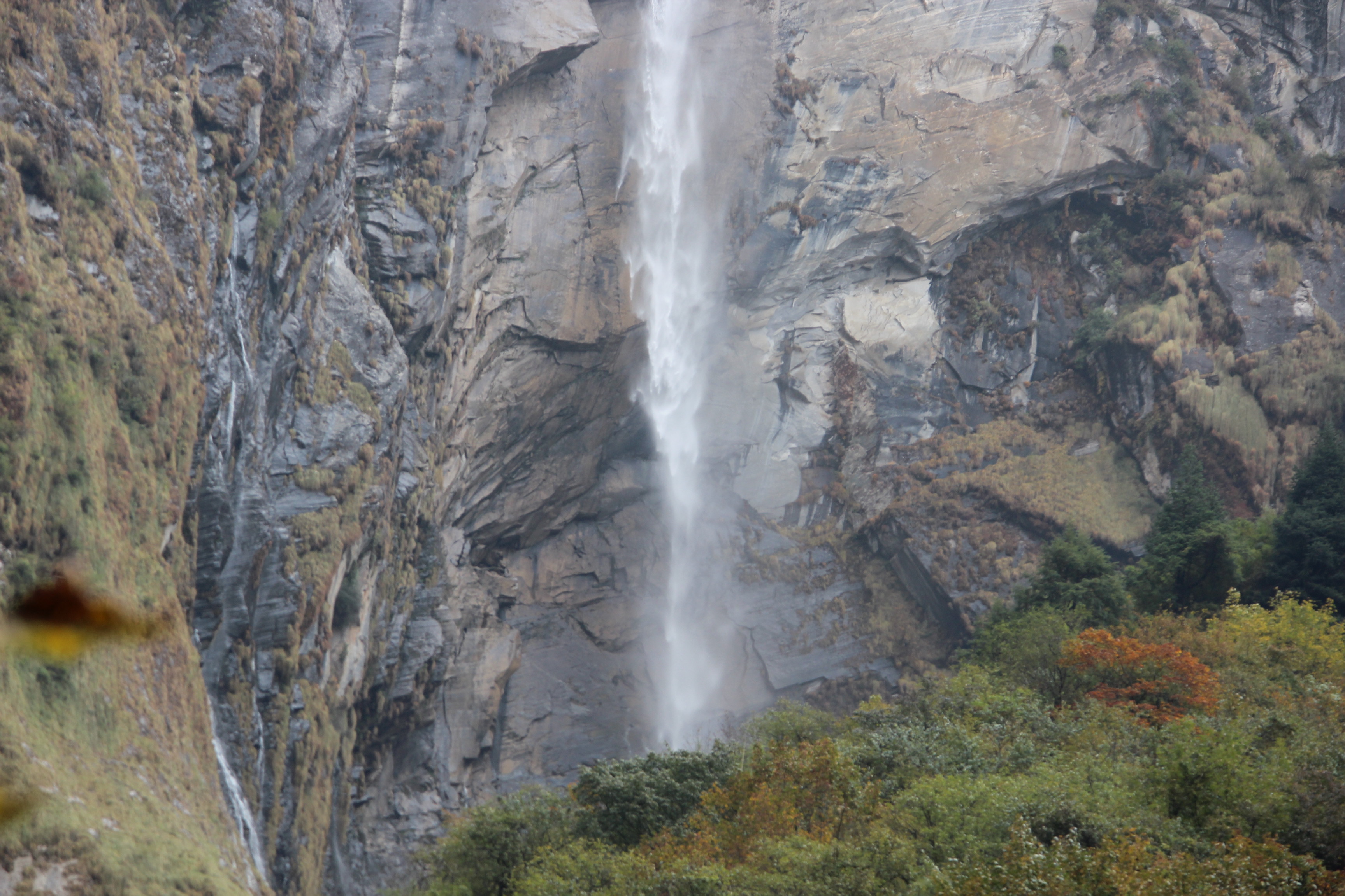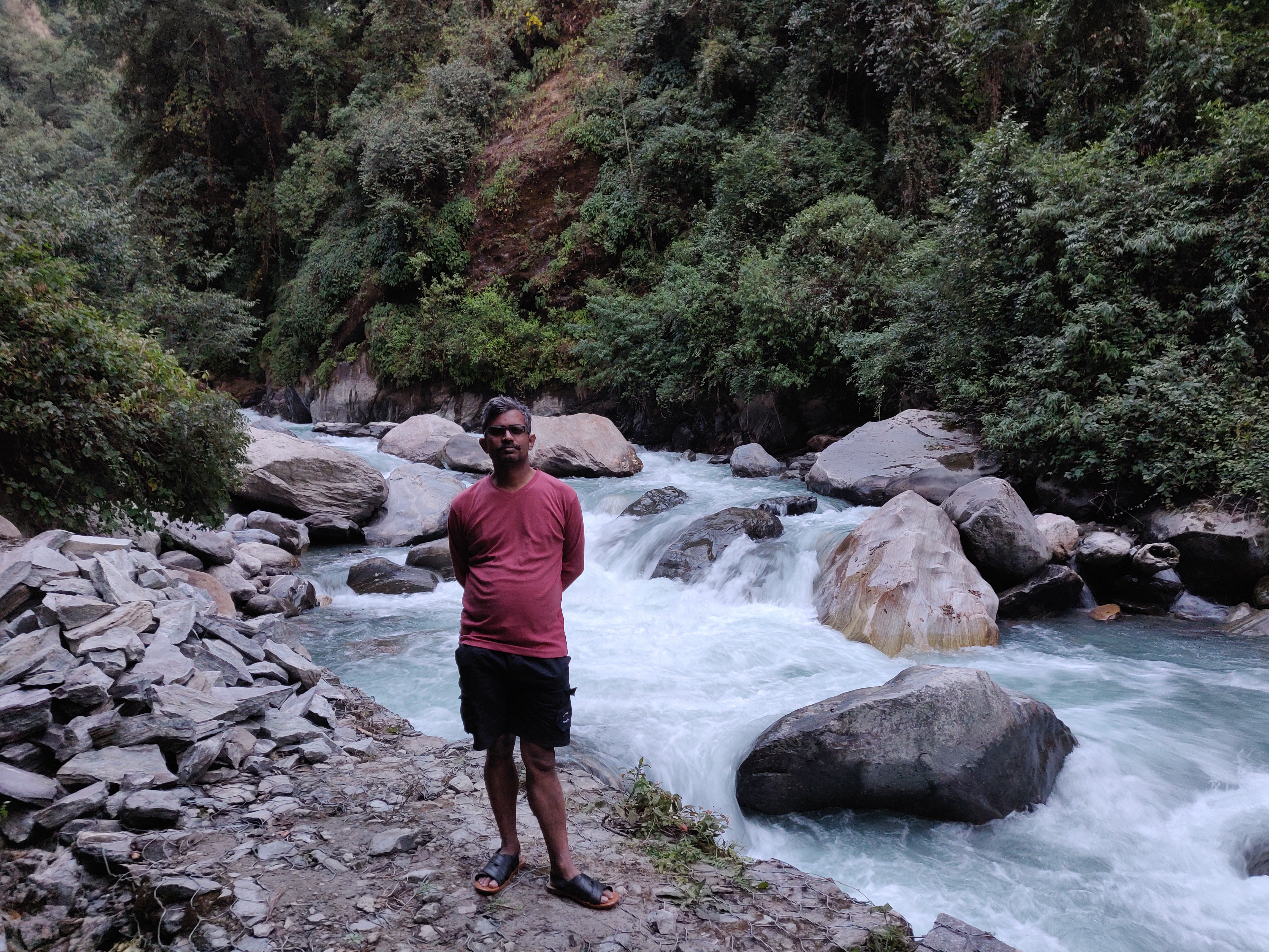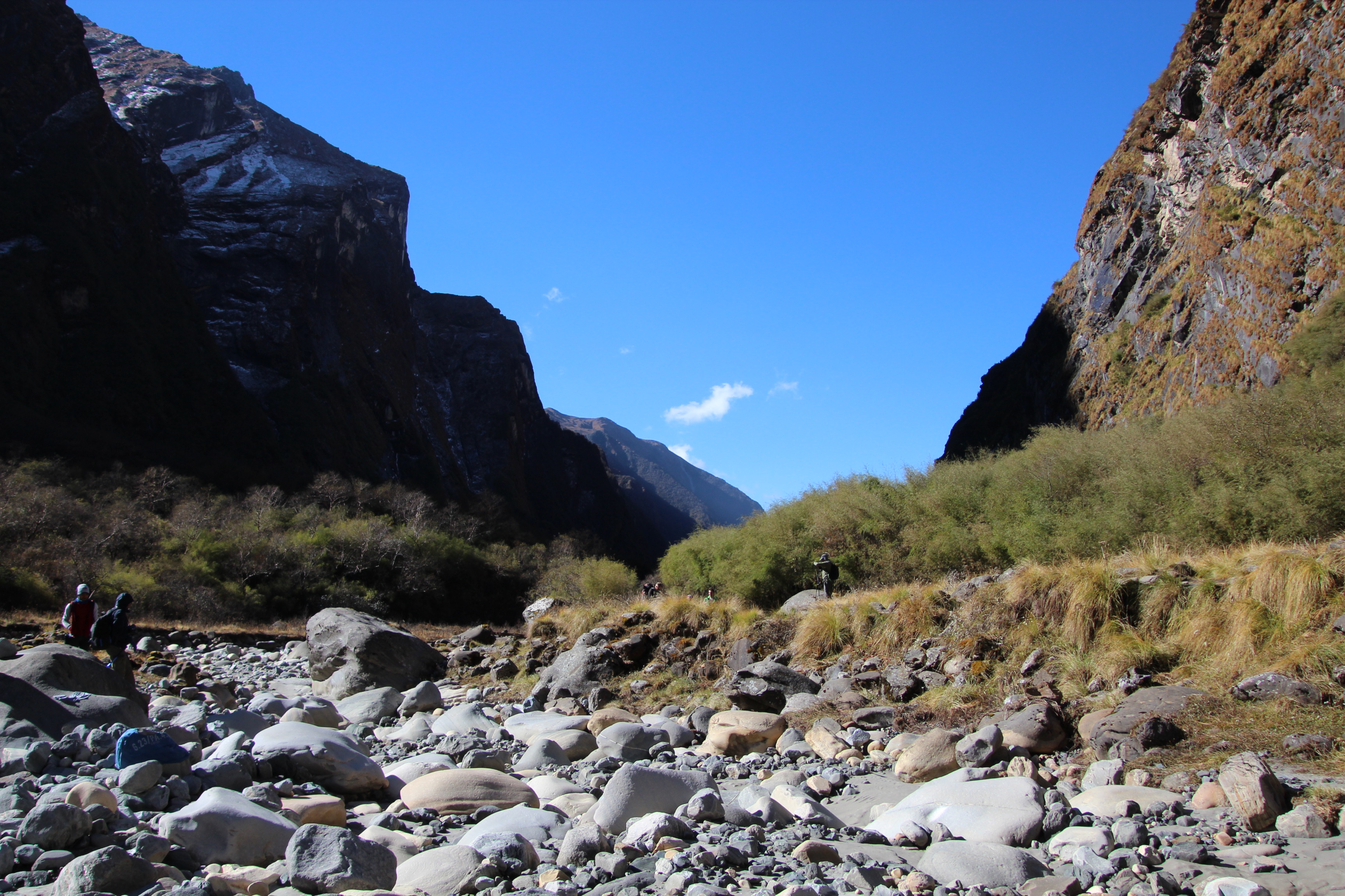 Sections of the trail were broken by land slides and the route was riddled with boulders, pebbles and loose grounds. We skid frequently, especially when the trail moved down towards the river bank. The views were ecstatic, but we had to focus on our feet while moving over unsettled grounds. The frequency of landslides, narrow trails, rock fall zones on this route gave a feeling that we humans are not always welcome in these “internal” areas of nature. As if it was giving us signs to stay away. It doesn’t like these relentless intrusions in its interiors in the form of ever increasing tea houses, tourists and the accompanying road construction. The trail now descended to the banks of the river, which roared down the gorges.