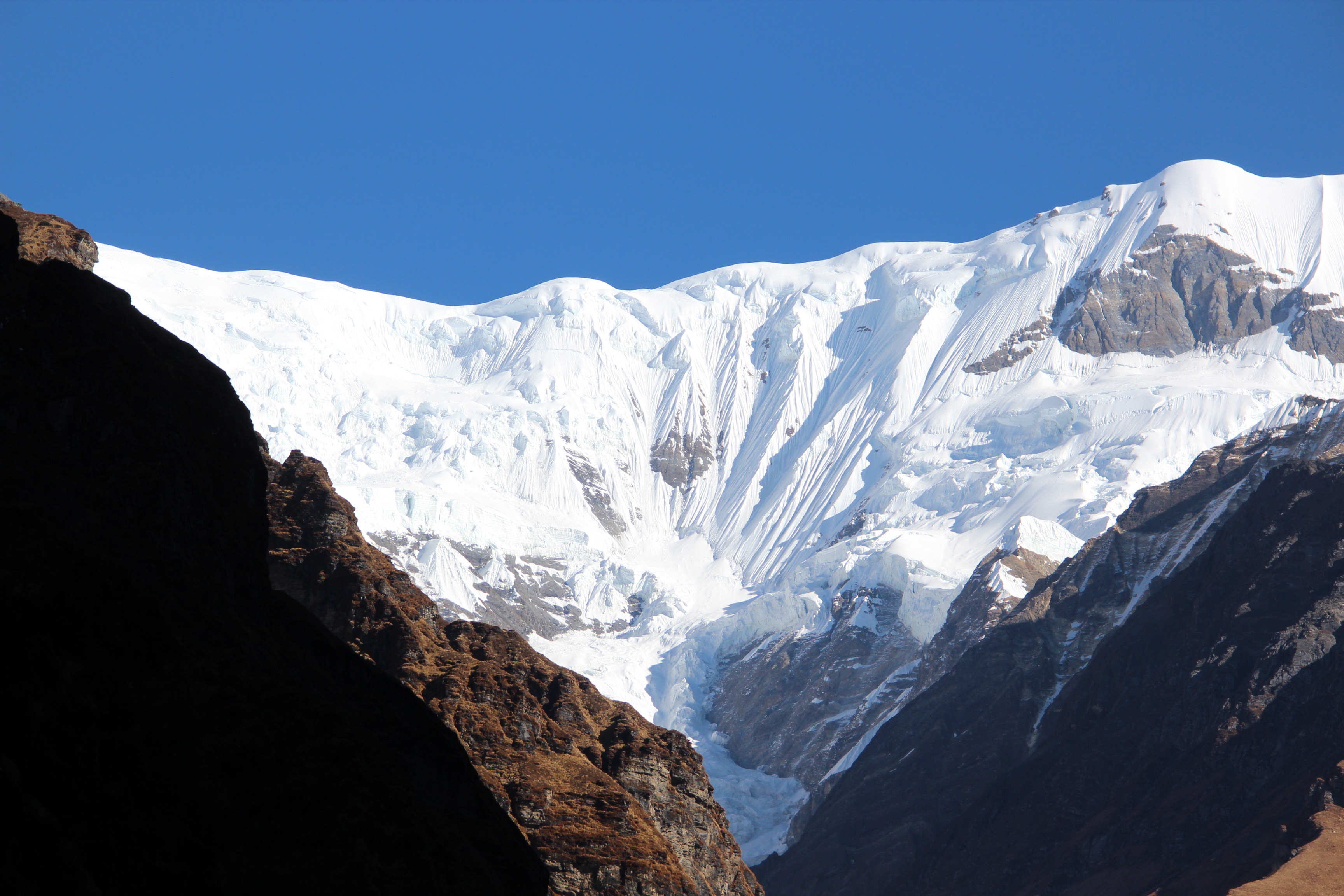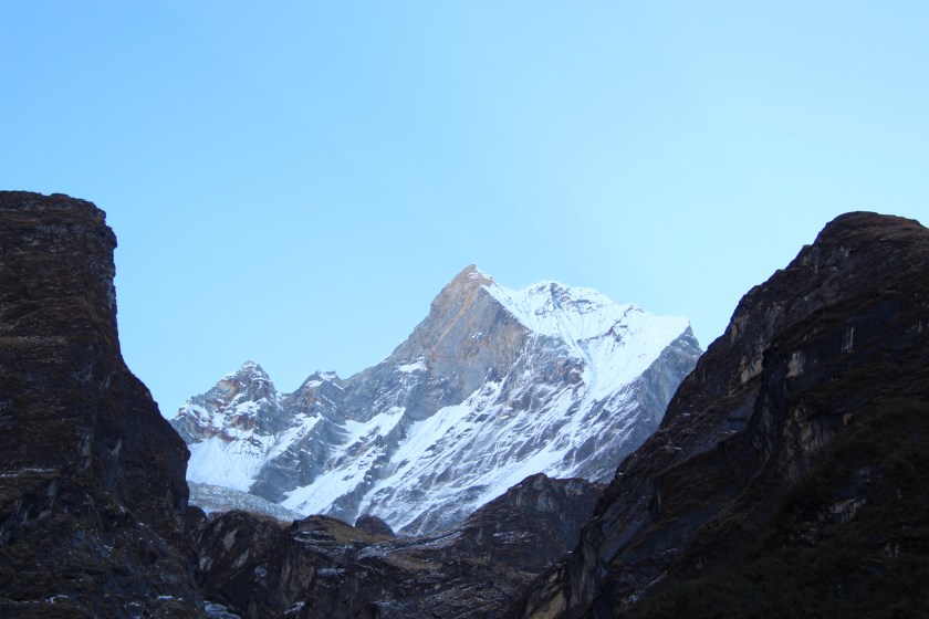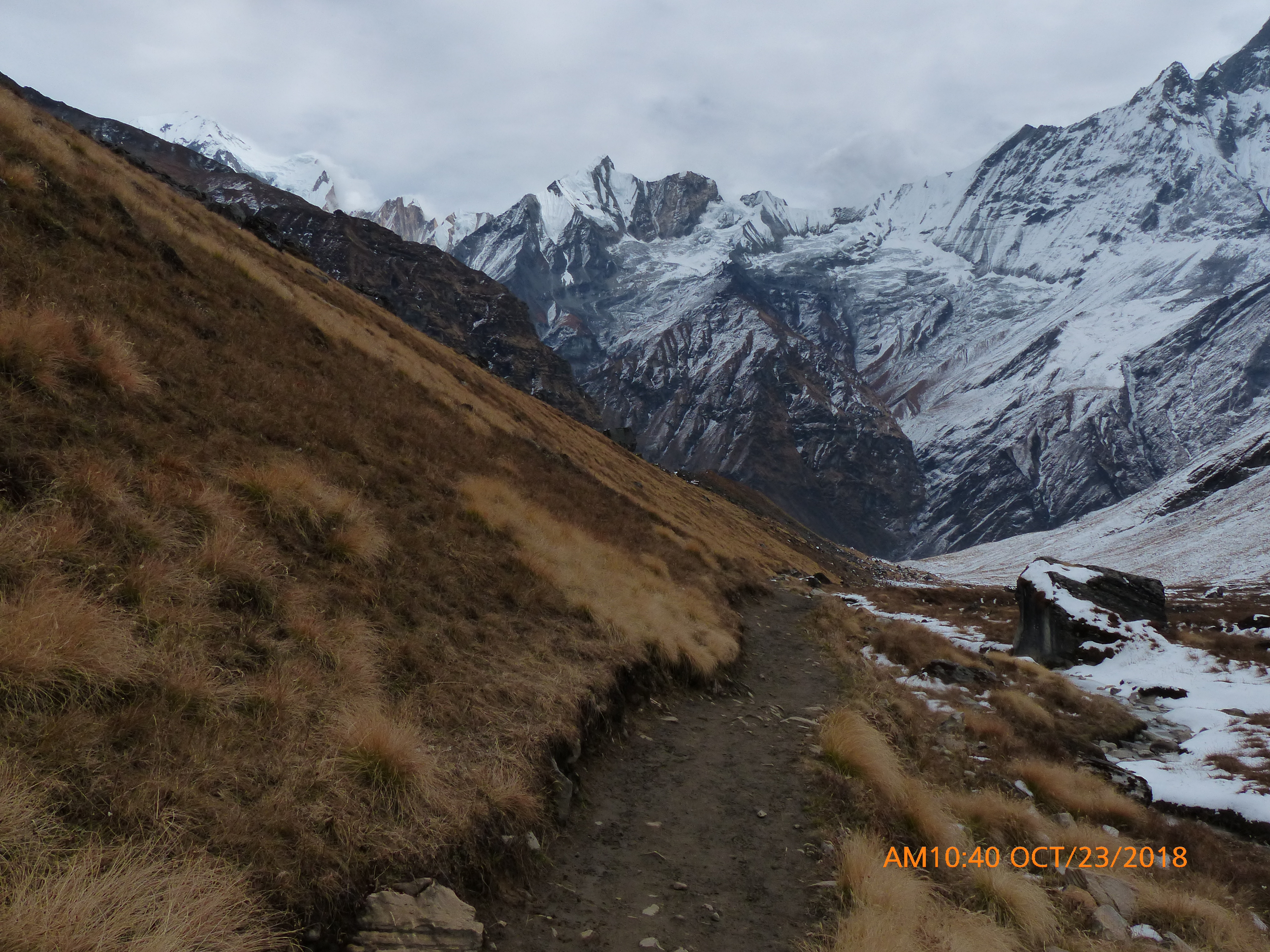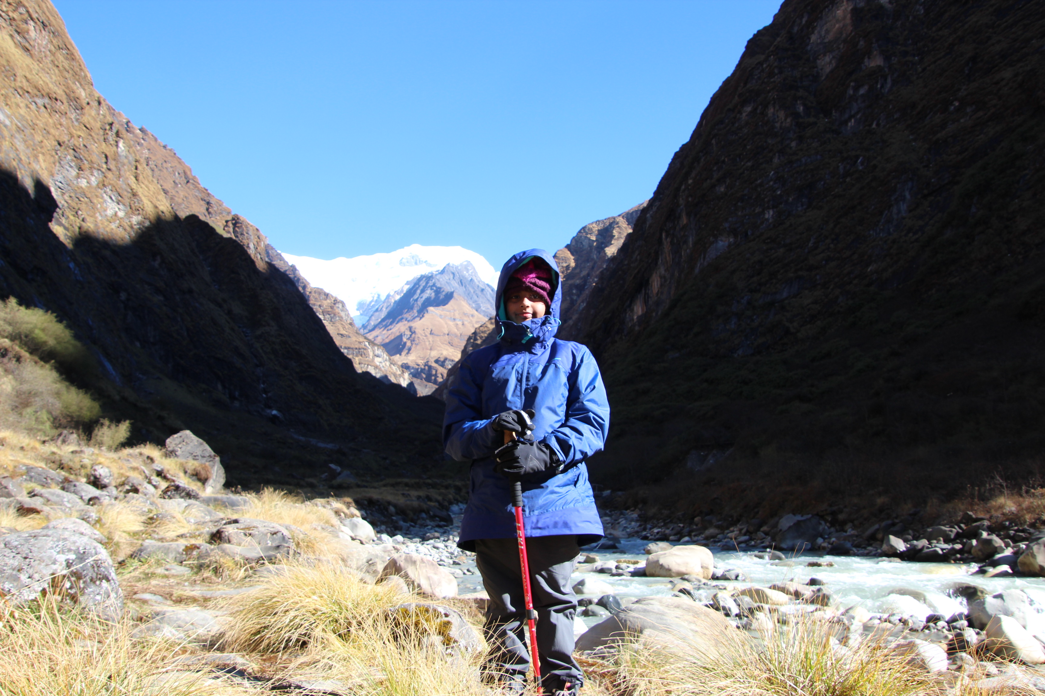 Sections of the trail were broken by land slides and the route was riddled with boulders, pebbles and loose grounds. We skid frequently, especially when the trail moved down towards the river bank. The views were ecstatic, but we had to focus on our feet while moving over unsettled grounds. The frequency of landslides, narrow trails, rock fall zones on this route gave a feeling that we humans are not always welcome in these “internal” areas of nature. As if it was giving us signs to stay away. It doesn’t like these relentless intrusions in its interiors in the form of ever increasing tea houses, tourists and the accompanying road construction. The trail now descended to the banks of the river, which roared down the gorges.