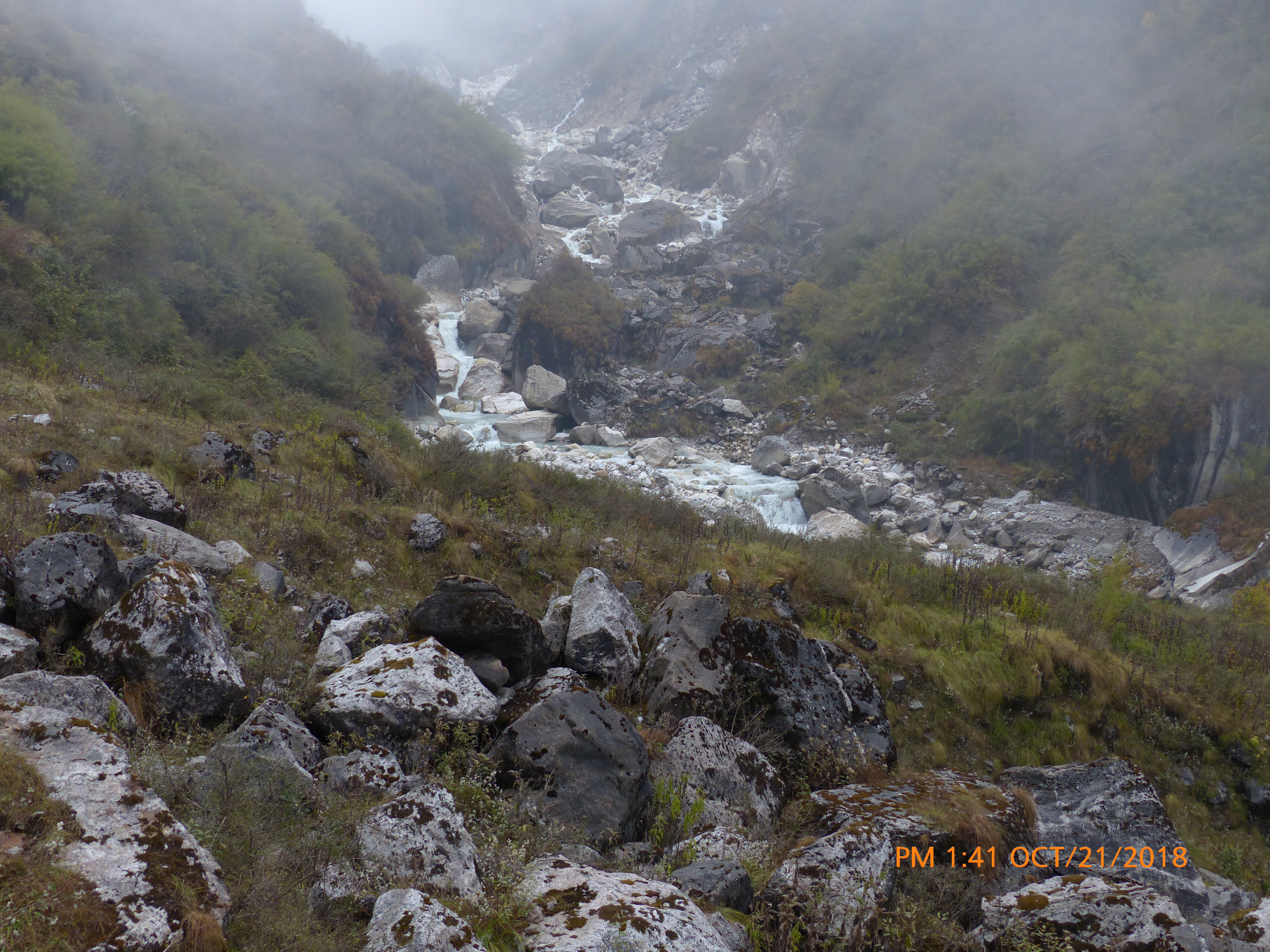 Machhakhola would be the site for lunch. Initially, it was supposed to be the destination for the day, but en-route, our guide decided to carry on after lunch for another 1-2 hours. That should lead us to Khorla Besi and hence, curtail the distance for the morrow by the same amount. The plan sounded sensible and we agreed to it. After reaching Machhakhola, we ordered lunch, which was Nepalese thali that included rice, lentils, vegetables and green chilies. This is the staple food of Nepal across all regions and for most of our destinations along the route, we stuck to this diet. As we started off after lunch, a light drizzle started, which increased on our way and finally we had to pull out our raincoats. Dhananjoy was walking ahead of rest of us and soon moved out of sight. Clouds now moved in front and covered the hills surrounding us. With clouds coming on, the cold increased.