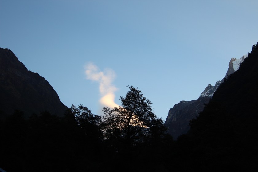 After walking for sometime, we saw Dhananjoy standing beside the road in a local shop. After reaching there, he dropped a bomb shell . He had left his water bottles at the tea house at Machhakhola. Our destination for the day was just ahead. The porters were reluctant to go back and fetch the bottles. After some deliberations, Dhananjoy himself went back. It was a tough ask at the end of the day, to go back the distance we just covered and repeat the same journey. It would take him at least two to three hours more. With all of us exhausted by the day’s walking, it was painful to even think of it, but he had no other option. We plodded ahead and reached Khorla Besi, a small village nestled amidst the hills with just a few tea houses. Our sweatshirts were drenched and we hung them on the wires, but with the moisture in the atmosphere, their chances of drying up were feeble. After arrival of Dhananjoy, Niladri pulled out the snacks and tea bags from his repertoire and we chatted along. Evening wore on and after dinner at 7 PM, we subsided to our rooms. We were sleeping at 1200 m.