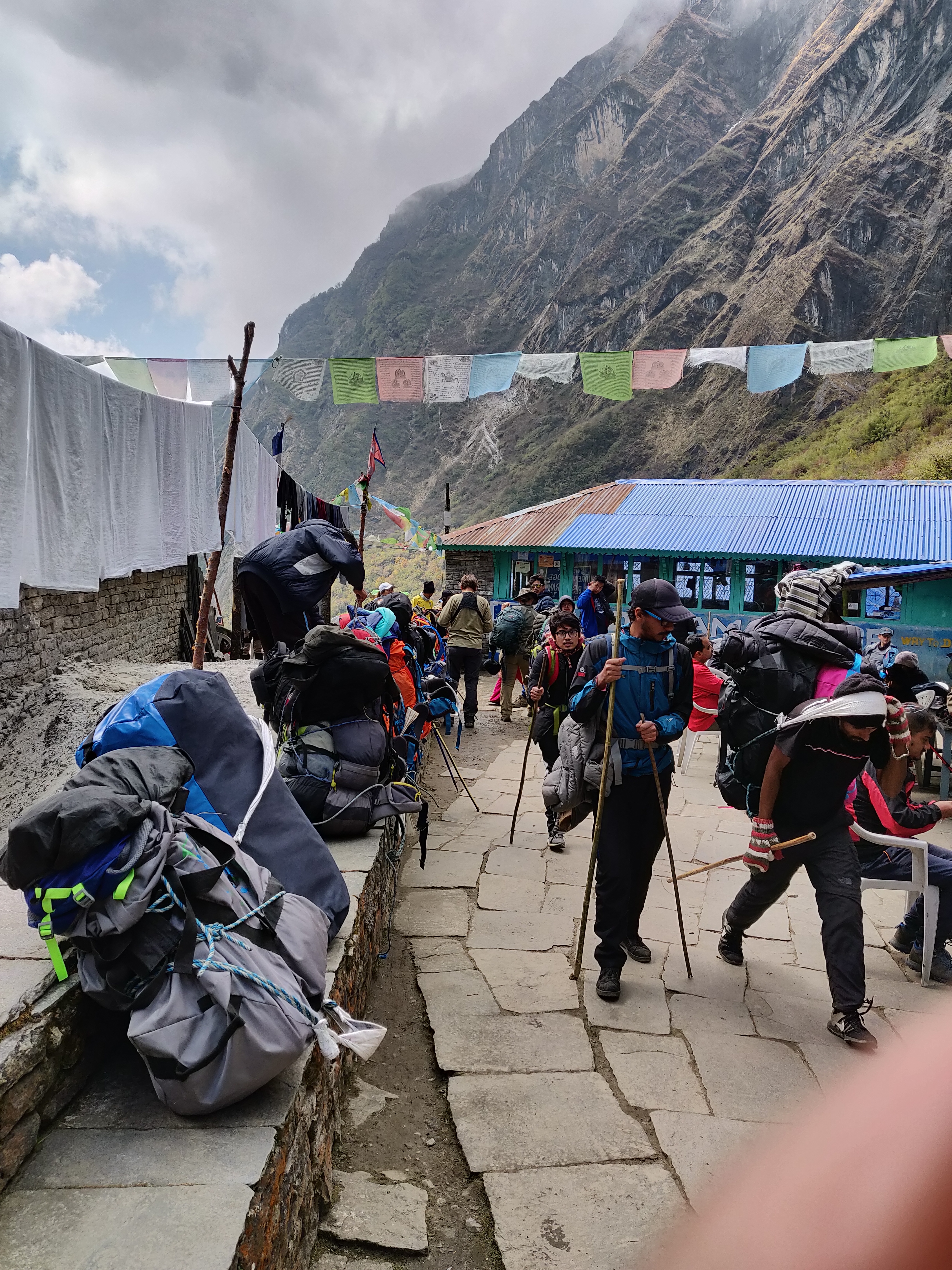 Herds of ponies kept crossing us and we had to make way for them. They are the lifelines to the upper reaches of the region. One has to be careful while encountering these herds. The trails are narrow and there’s no luxury of space. The ponies are often burdened with loads and they don’t tolerate any obstruction on their way as it’s very difficult to contain their momentum with loaded backs. Hence, it’s the pedestrians who have the make way for them on the way up or down. Things can get tricky on narrow blind bends. Since you can’t see the other side (hidden from your vision by the mountain walls), you may come across them unexpectedly. But the good thing is they have bells hung in their necks which keep ringing and can be heard from a distance. The moment you hear them, keep an eye to judge how far they are at the back or in front and whether you can cross the upcoming narrow passage before they reach that point. Paving way for them isn’t easy always as space is a luxury on these trails at many places and at times, you have to slant your body along the rising walls to give them passage. The key here is to reach a convenient point of passage early enough where you can stand decently and wait for them to cross instead of clamoring for space which can be precarious and dangerous at times.