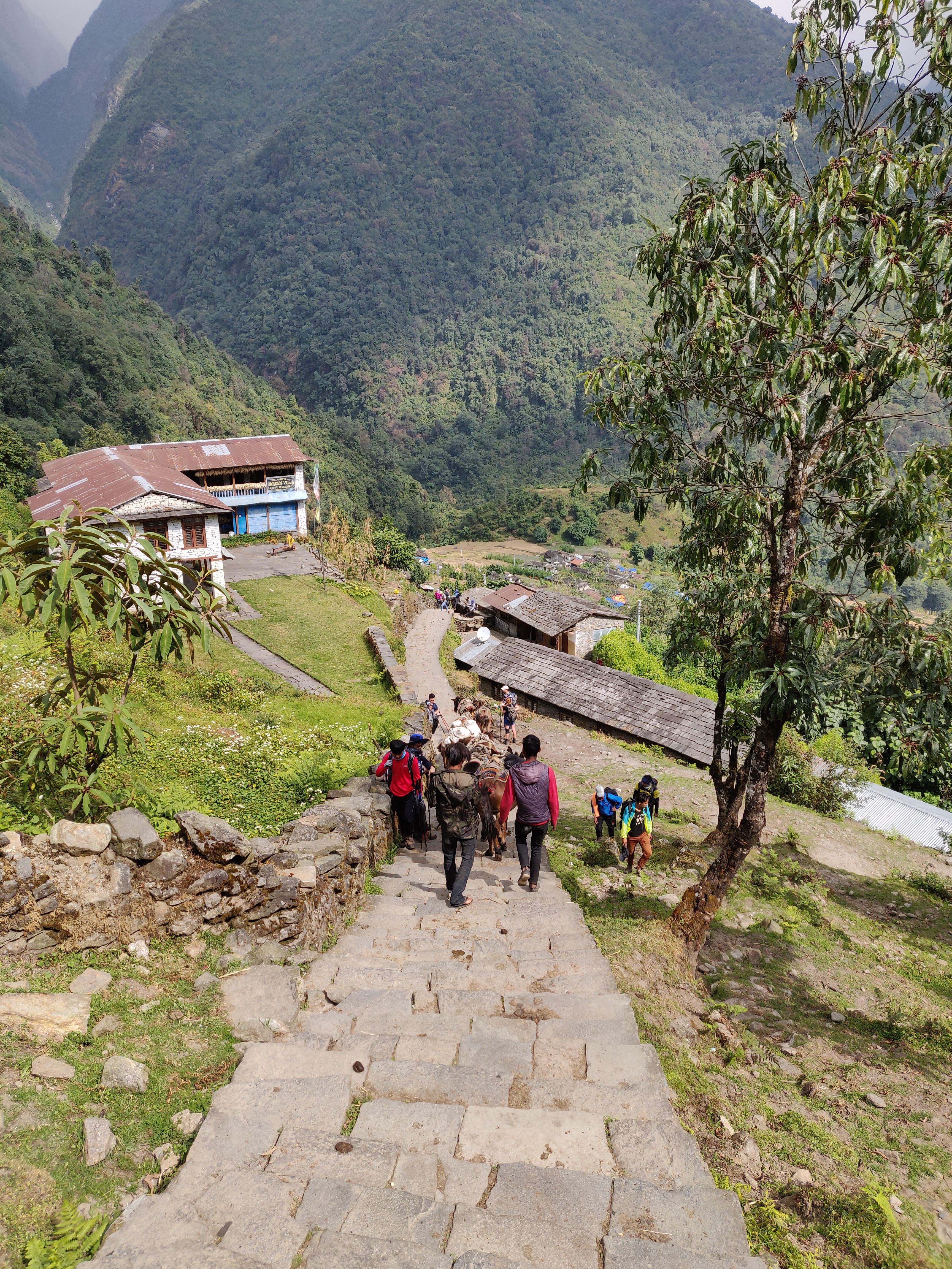 This walkway deserves some mention. The earthquake of 2015 and the changing courses of the rivers had devastating effects on the trail to Jagat. At times, these events eroded large sections of the old trail. For quite sometime, the access to Jagat was through steep rising trails followed by sharp and dangerous drops. People from the valleys of Tsum, Nubri and other remote areas are heavily dependent on supplies and aids from the lower regions which were difficult to reach since the trail between Machhakhola and Jagat got severely damaged by the aforesaid events. Then, a Swiss company was tasked to make the trail safe in this section. After a superb display of engineering and an arduous effort put in by the locals, they came up with what is now called the walkway. It is a level steel bridge supported by angular structures clamped into the vertical rocky walls that rose up from the valley. After lunch, we resumed our walk and crossed a stoned stair case to reach the newly built walkway.